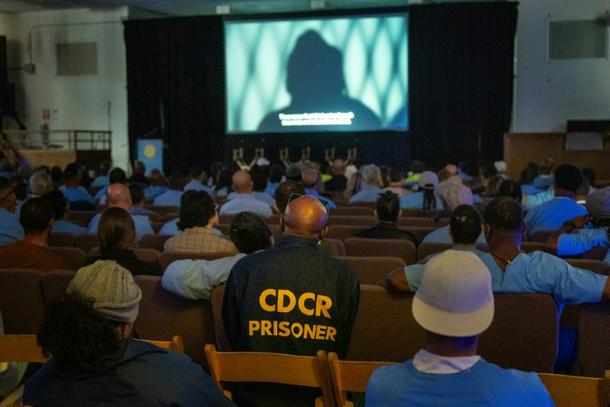 Inmates and guests watch a screening during the San Quentin Film Festival at the infamous California prison
