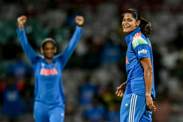 India's Radha Yadav (R) celebrates after taking a wicket at the World Cup