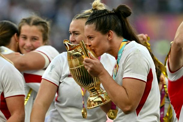 England lock Abbie Ward kisses the Women's Rugby World Cup trophy