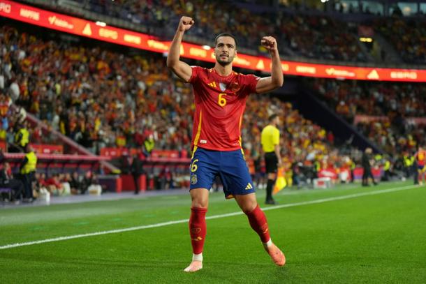Spain midfielder Mikel Merino celebrates scoring his team's first goal during the 2026 World Cup qualifier against Bulgaria