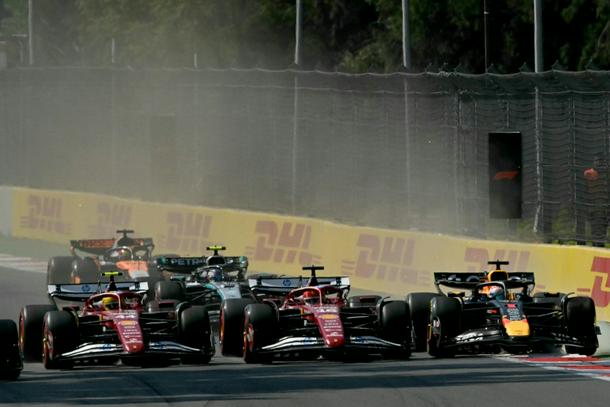 Lewis Hamilton, Charles Leclerc and Max Verstappen jostle for position in Mexico