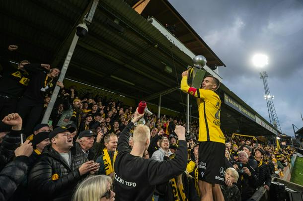 It was a party atmosphere as the crowd chanted “Swedish champions, Swedish champions,” at the club’s windswept 6,000-seat Strandvallen stadium.