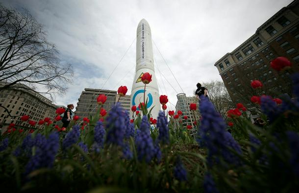 An inflatable nuclear missile balloon installed for a protest by the group Global Zero in Washington on April 1, 2016