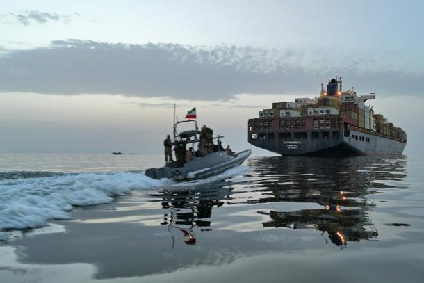 This photo obtained by AFP from the Iranian news agency Tasnim shows an Islamic Revolutionary Guard Corps (IRGC) boat allegedly taking part in an operation to seize ships attempting to cross the Strait of Hormuz, on April 21, 2026