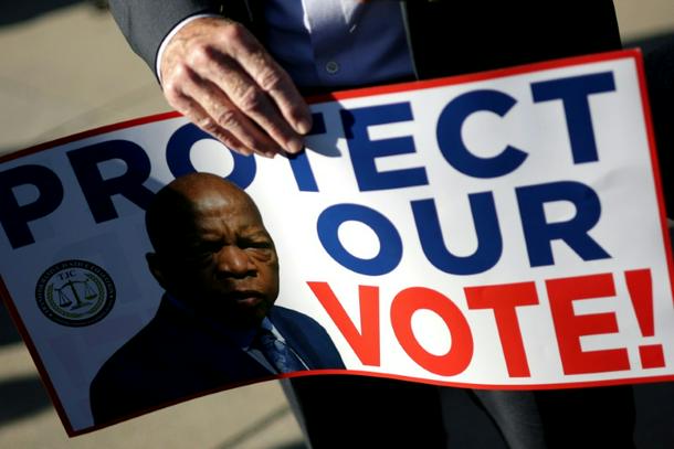 A demonstrator holds a sign outside the Supreme Court during oral arguments in a pivotal voting rights case